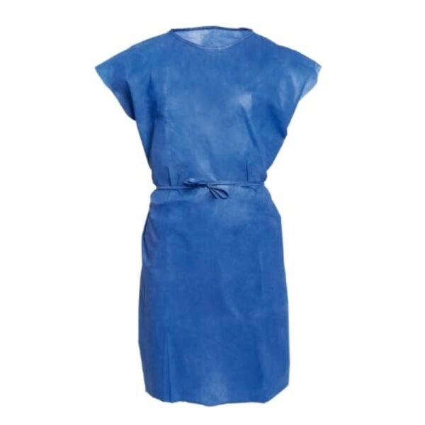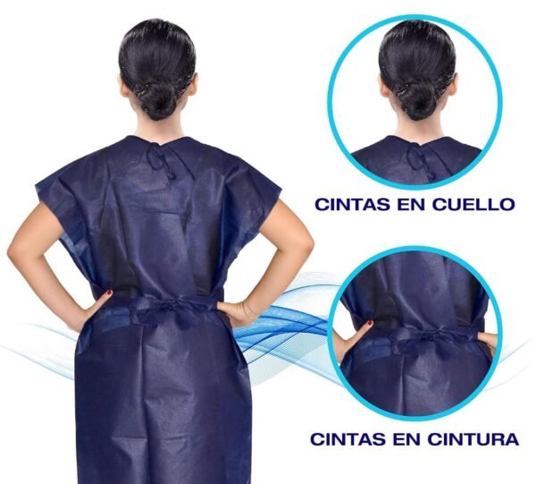 Bata de exploración médica desechable, fabricada en polipropileno de 45 g/m². Diseño sin mangas, cuello redondo y cierre con cintas a cuello y cintura para un ajuste seguro.