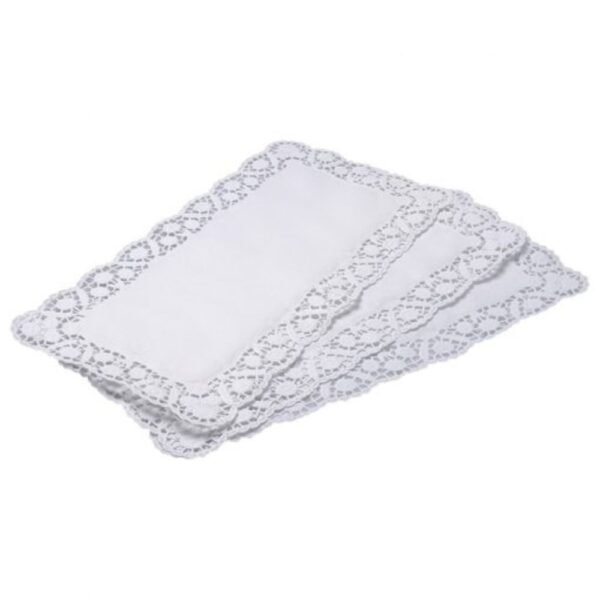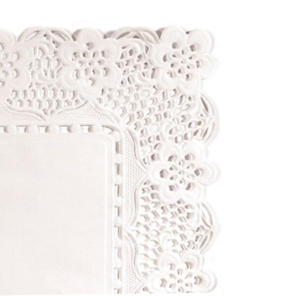 Blonda rectangular con calados para pastelería de color blanco fabricada con un alto gramaje de 53 g/m2, con lo que se garantiza una altísima calidad del producto.